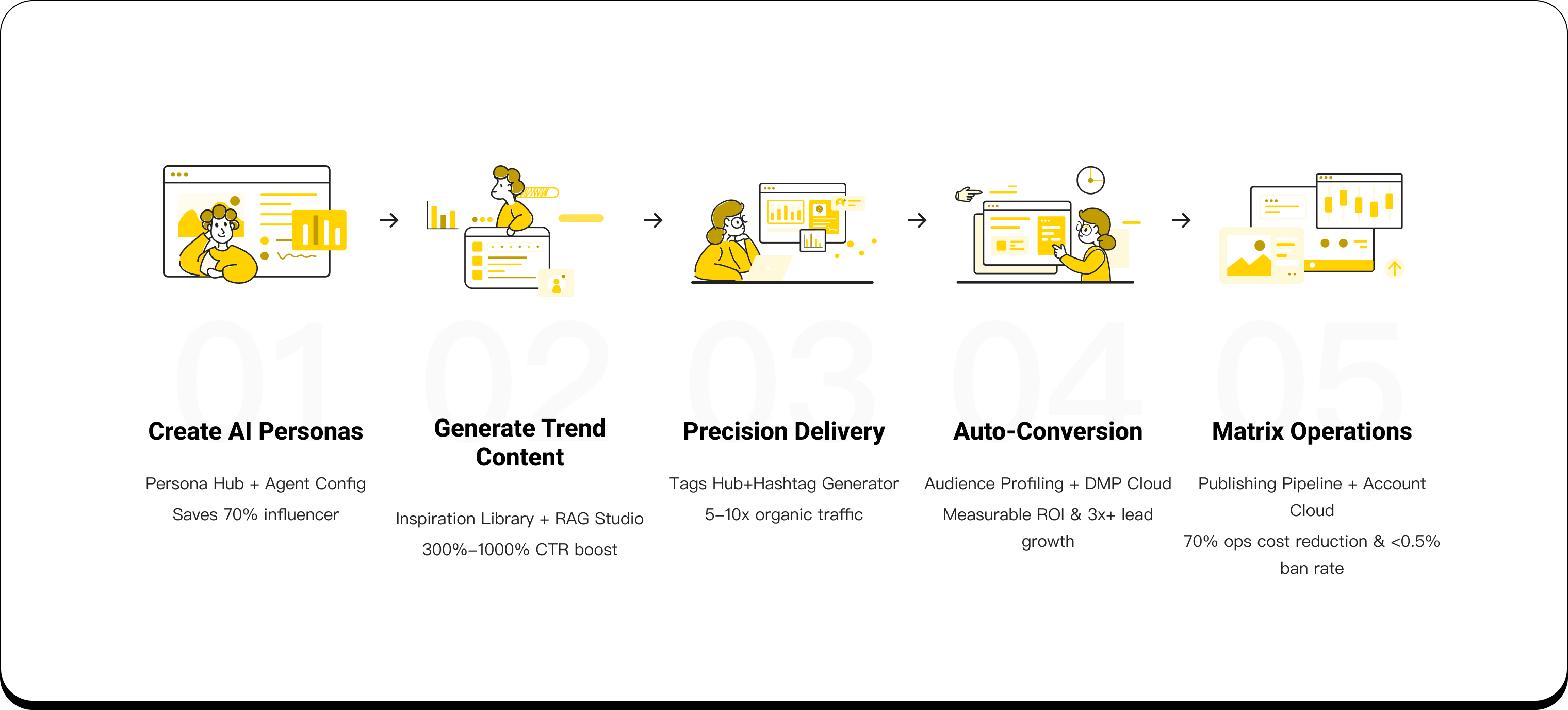 AI generates persona-driven marketing content to precisely target audiences and acquire customers 24/7 across all platforms.